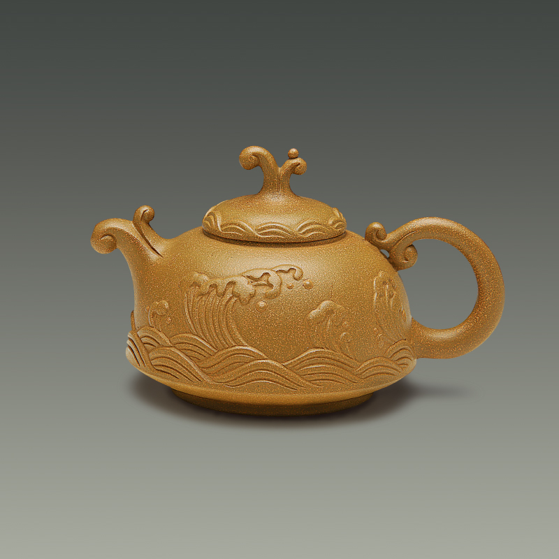 此壶以浪涛之形为壶身,以浪花之形为壶盖和壶嘴,以巨鲸翻腾时露出的尾巴之形为壶把。愿和我一样曾在大海里畅游过的朋友,见此壶能为知己。